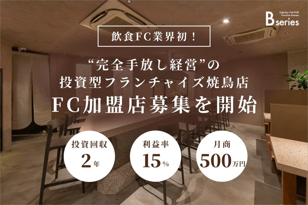 【飲食FC業界初】完全手放し経営の投資型フランチャイズ「ハイクラス焼鳥店『Bシリーズ』」の加盟店オーナー様を募集開始。