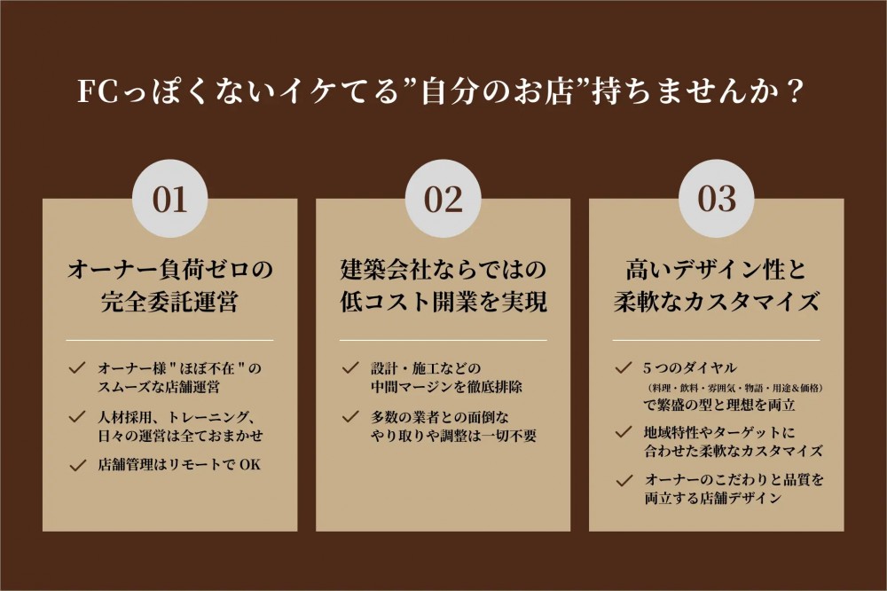 一般的なフランチャイズとは違い、チェーンのレギュレーションに縛られず、ブランドの芯と繁盛の型は固定しつつ、立地やオーナーの意図や意思に合わせて世界観を調整できる“可変フォーマット”を採用することで加盟店オーナー様にとって”あなたのお店”を手放しで所有することが可能になりました。