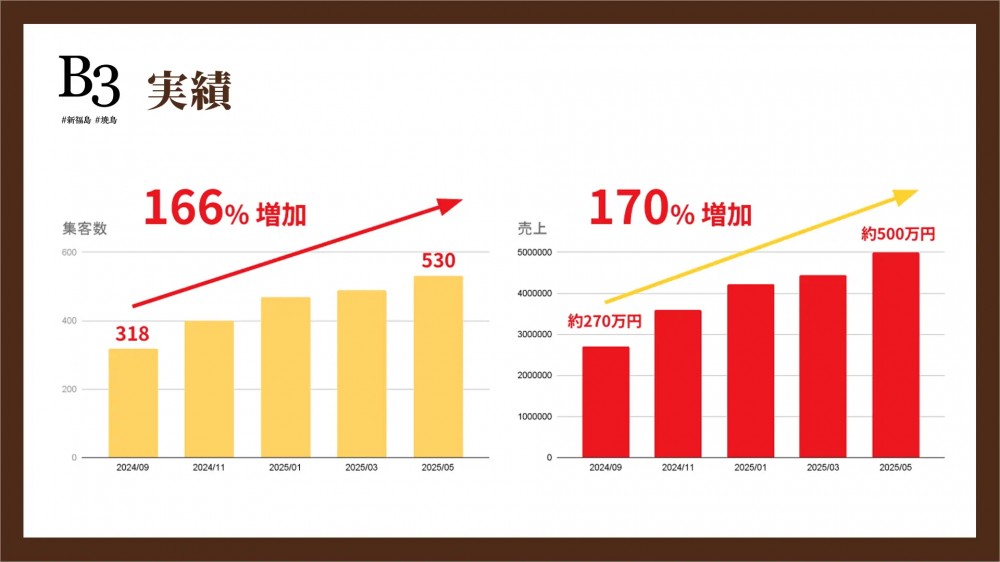 大阪・新福島の直営店「新福島焼鳥B3」は、17席の小規模店舗にもかかわらず月商平均約500万円、営業利益率14 -18%を確保。オープン初年度は来店客数160%成長、売上170%成長と事業を伸長させました。