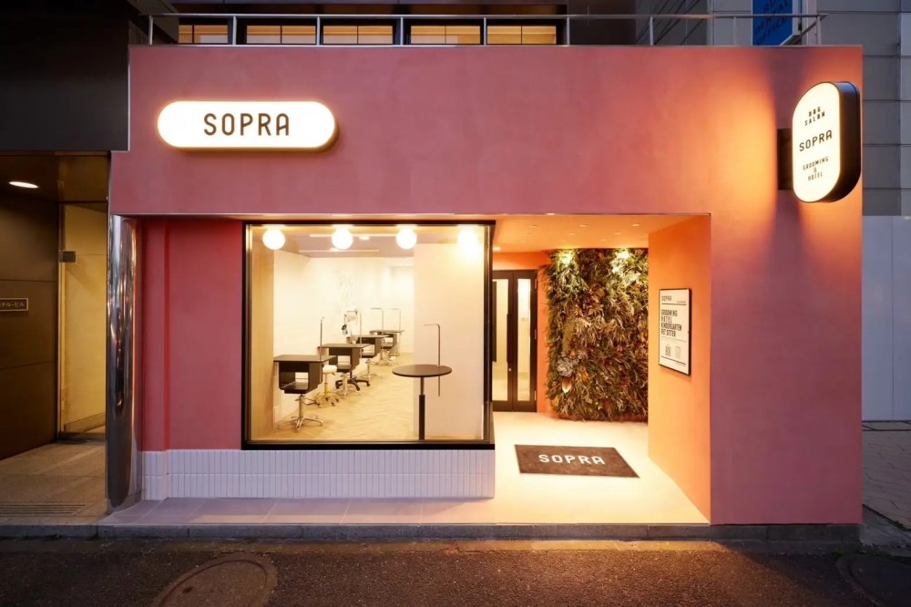 SOPRAの店舗外観。トリミングを中心に、ペットホテルや犬の幼稚園など複数のサービスを提供する複合型ペットサロンモデル。