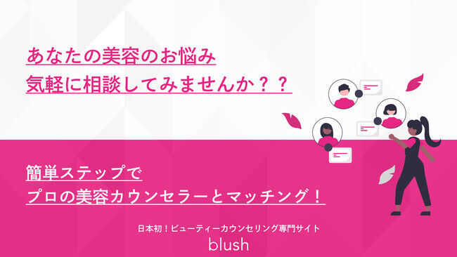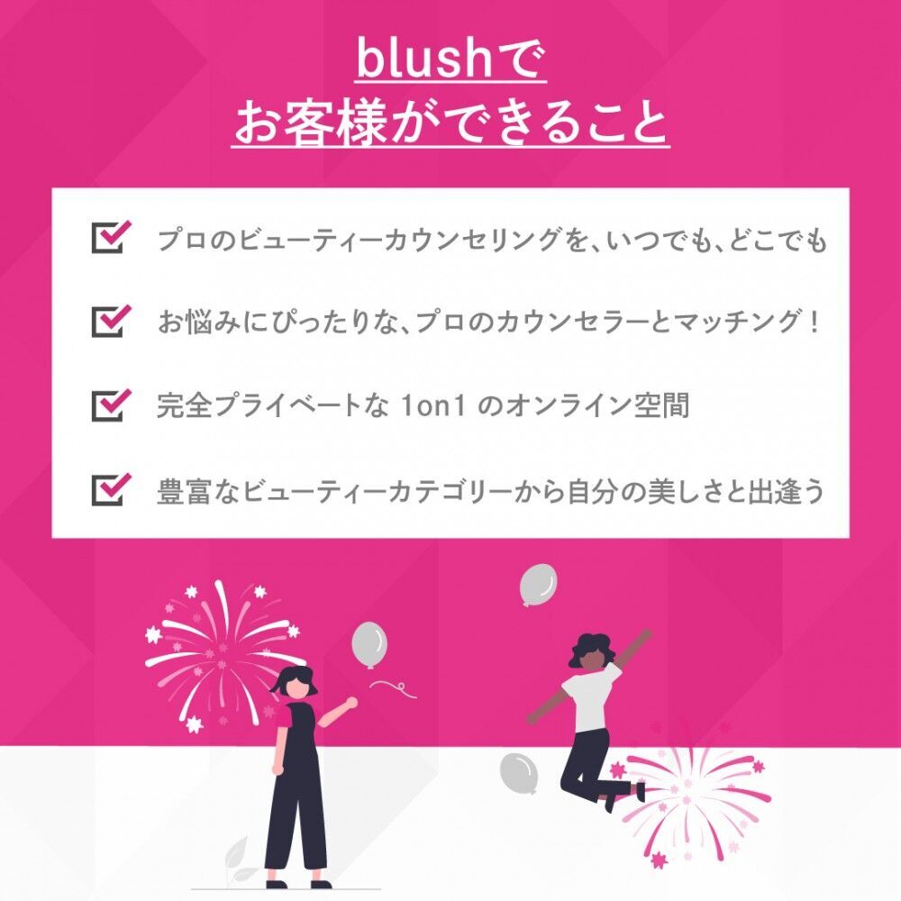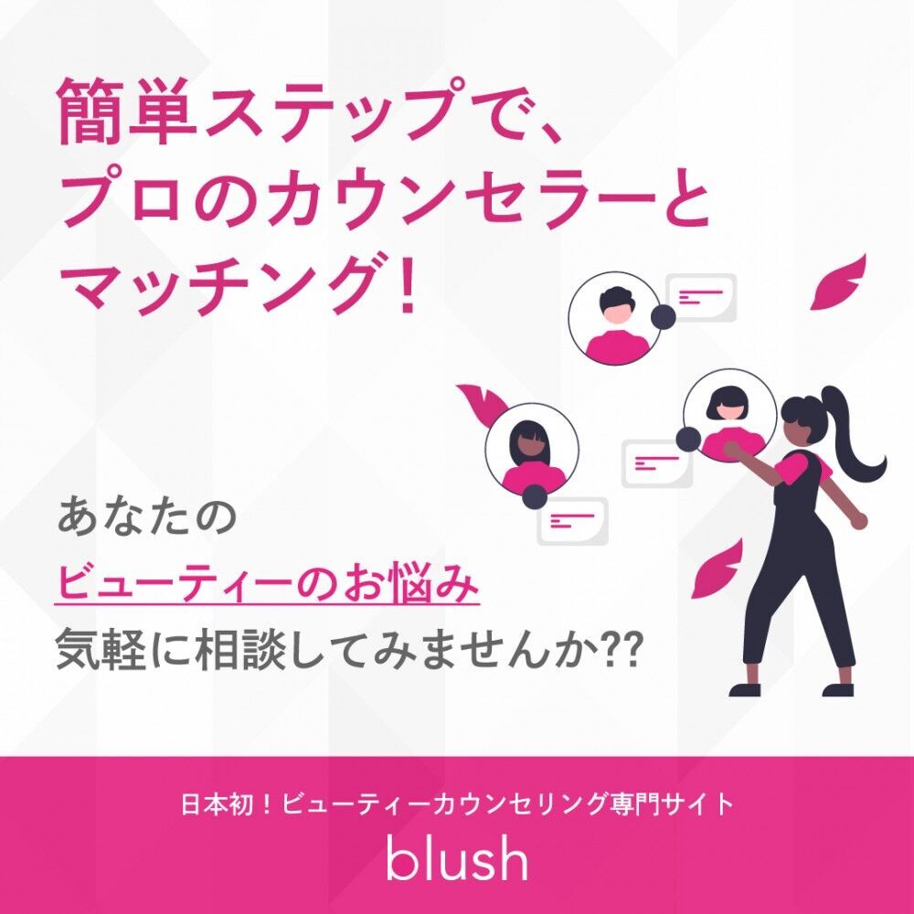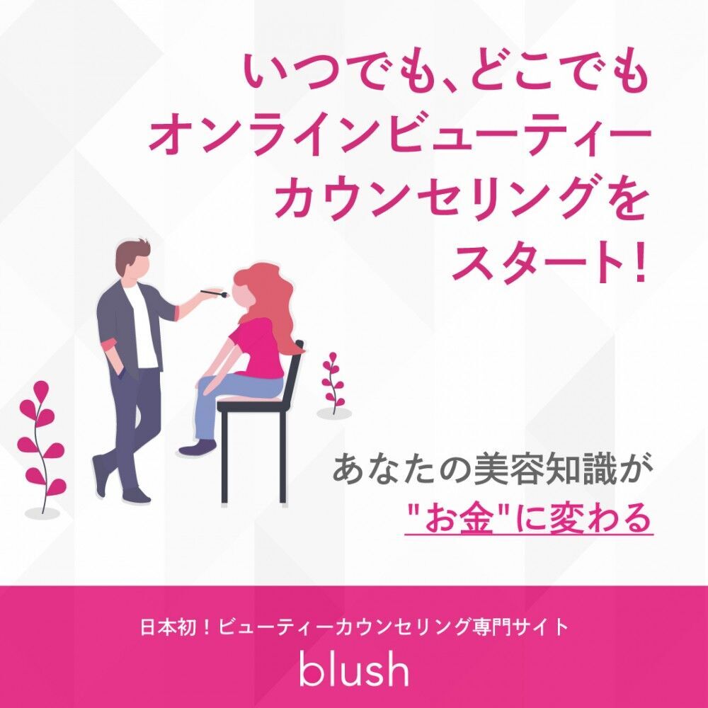 blush(ブラッシュ)とは、メイクアップからスキンケア、ヘアスタイリング、ヘアケア、ボディメイク、ファッションまで様々なビューティー(美容)に特化した化粧品・美容業界におけるオンラインカウンセリングのCtoCデジタルプラットフォームです。