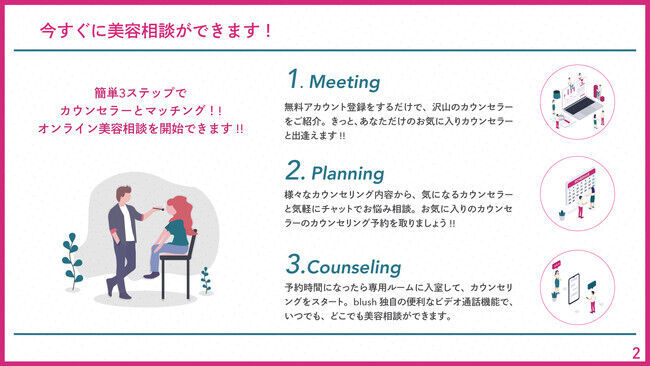 Step3:予約時間になったら専用ルームへ入室して、オンラインカウンセリングをスタート!blush独自の便利なビデオ通話機能で、いつでも、どこでも、上質なサービスを届けることができます。