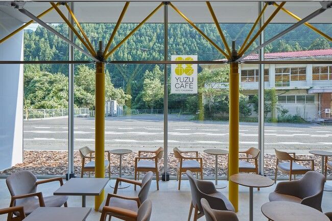建物の周りには、地面の乾燥や雑草・太陽光の反射・泥はねの防止等のため、やがて土に還ることのできる樹皮チップが敷き詰められ、店内の陳列棚はすべて木製で木頭の大自然を思わせる温かみを感じる設計。木頭ゆずをイメージしたイエローのテーマカラーとモダンなグレーの色合いが美しいデザインです。クリエティブディレクションを鵜野澤啓祐氏、そして、建築・インテリアデザインをコクヨ株式会社様・株式会社GEN様にご担当いただきました。
