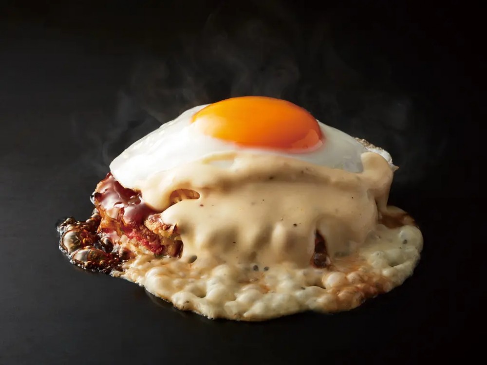 お好み焼きにとろとろの黄身と特製ソース、とろけるチーズがベストマッチ!『おこほん』の月見をお楽しみください。