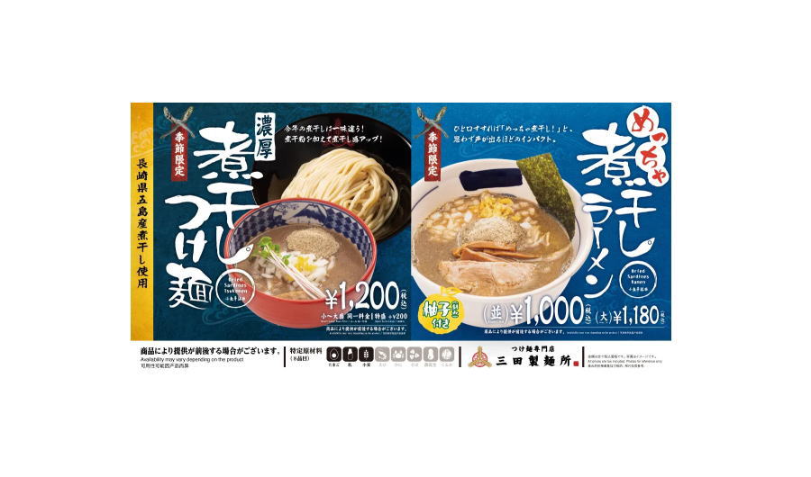 11月1日(土)より、人気の「濃厚煮干しつけ麺」が今年も登場。さらに新作「めっちゃ煮干しラーメン」が加わり、この冬は煮干しの魅力を存分に味わえるシーズンに。