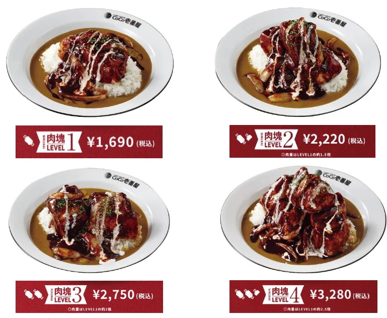 「ホロ肉ドカンとデミグラスカレー」は、ご注文時に肉塊レベルをお選びいただく「肉塊オーダー制」です。肉塊レベルは豚肩ロース肉の量を表しており、LEVEL1~4まで4段階のサイズをご用意しました。お好きなサイズをご注文いただき、心ゆくまで肉塊をお楽しみください。