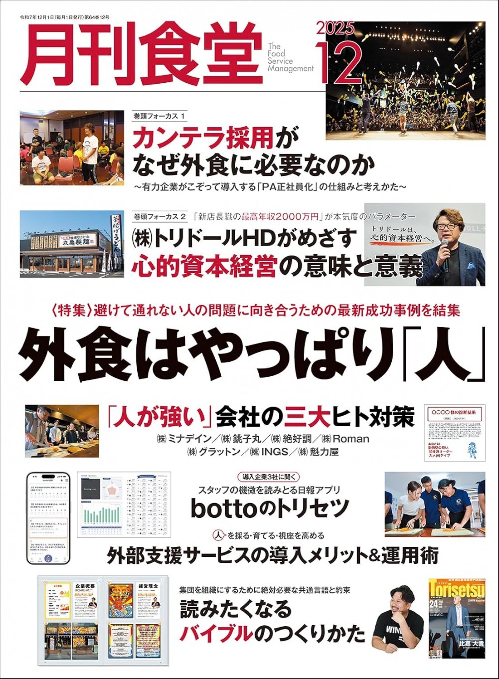 深刻化する人材難に対して打つ手がないと嘆く企業も少なくありませんが、厳しい状況下だからこそ、新しい視点や施策、画期的なサービスが生まれるという側面もあるでしょう。また、どれだけDXや機械化が進んでも、人にしか果たせない役割は依然として大きいといえます。12月号では外食企業の人づくりの現在地を検証すべく、6つの企画を通して新たなスキームや考えかた、制度設計、運用などを多角的に取材。避けて通れない人材問題への対処法を探ります。