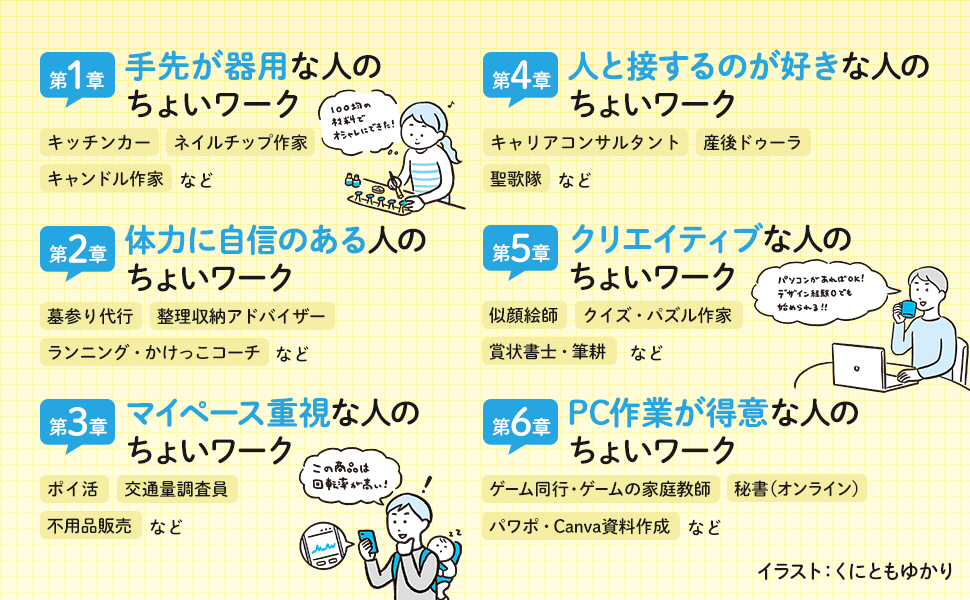 出張カメラマン/墓参り代行/レシピ開発/巫女/エキストラ/ポイントせどり/ 1日カフェオーナー/選挙スタッフ/聖歌隊/キャラクターデザイン/クイズ・パズル作家/産後ドゥーラ/ランニング・かけっこコーチ……