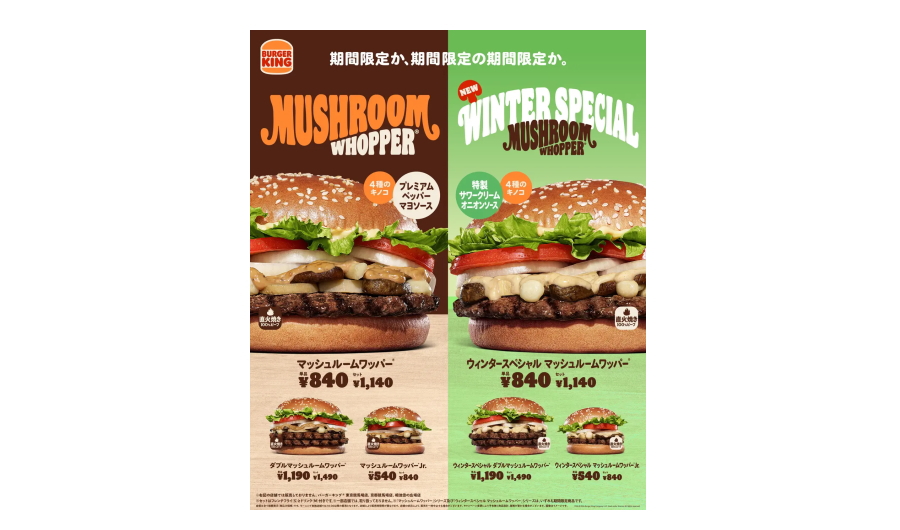 株式会社ビーケージャパンホールディングス(本社:東京都千代田区、代表取締役社長:野村一裕)は、2026年1月9日(金)より、4種のきのこと直火焼きの100%ビーフパティを、まろやかなサワークリームと、オニオンペーストの旨味に3種のハーブがほのかに香る「特製サワークリームオニオンソース」で仕上げた『ウィンタースペシャル マッシュルームワッパー® 』『ウィンタースペシャル ダブルマッシュルームワッパー® 』『ウィンタースペシャル マッシュルームワッパー® Jr.』の3商品を期間限定で新発売いたします。