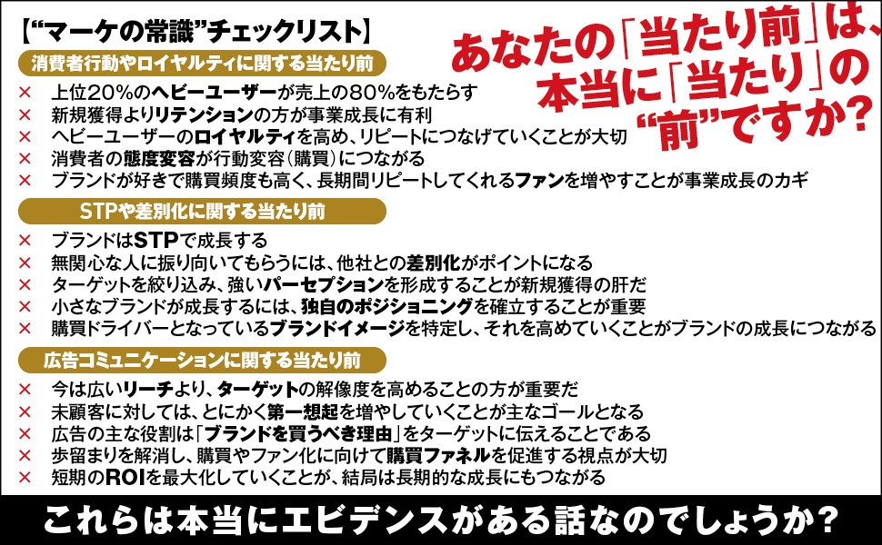 本書では、このような「みんなそう言ってるから、まあそういうものなんだろう」的な話の根拠を、海外の実証研究や論文を中心に徹底的に掘り下げました。その結果、事実ではない、一般的に有効とは言えないケースが数多く見つかりました。消費者理解から商品開発、プライシング、流通、広告コミュニケーションまで、戦略や戦術に関わるほぼ全ての面で「根本的な事実誤認」があるようです。