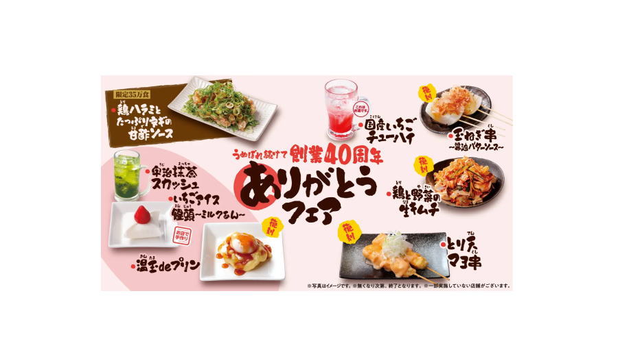 焼鳥屋「鳥貴族」は、2025年5月1日に40周年を迎えることができました。お客様や取引業者様、店舗で働く社員さん、鳥貴族に関わる世界中の人に感謝をお伝えするべく、『うぬぼれ続けて創業40周年 ありがとうフェア』と題し、年間を通じてみなさまに喜んでいただけるような期間限定メニューを展開しています。