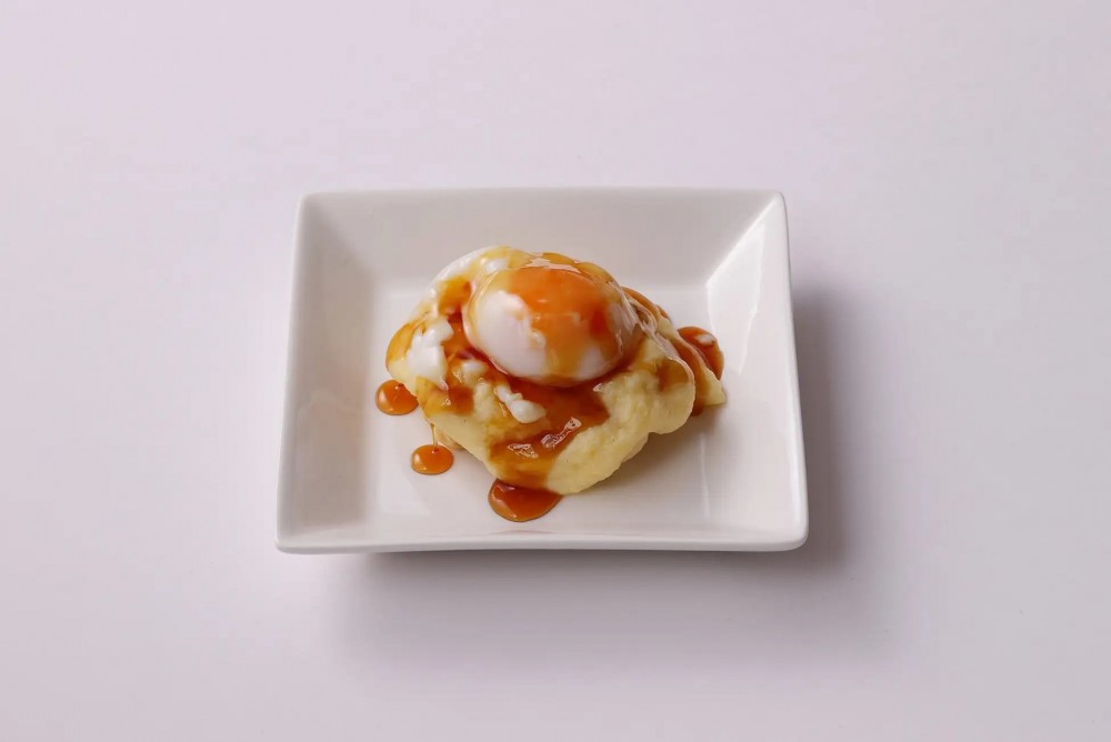 商品開発チームが試行錯誤の末、作り上げた渾身のプリン風!?のデザートです。ワッフルの上になめらかなカスタードソースと温玉をのせ、メイプル風味のソースで仕上げました。温玉を崩して混ぜながら食べると、プリン風の味わいが楽しめる不思議なスイーツです。ぜひ1度ご賞味ください!