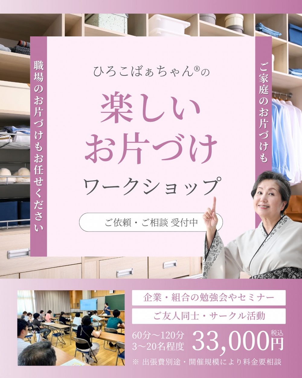 家庭や企業、オフィス、倉庫などの「片づけコンサルティング」:ただ物を整理するだけでなく、「その人が本当に必要なものは何か」「どう生きたいのか」「どんな自分でありたいのか」を一緒に考えるスタイル。依頼者の暮らしや人生観すら整理する「心のお片づけ」も含む。