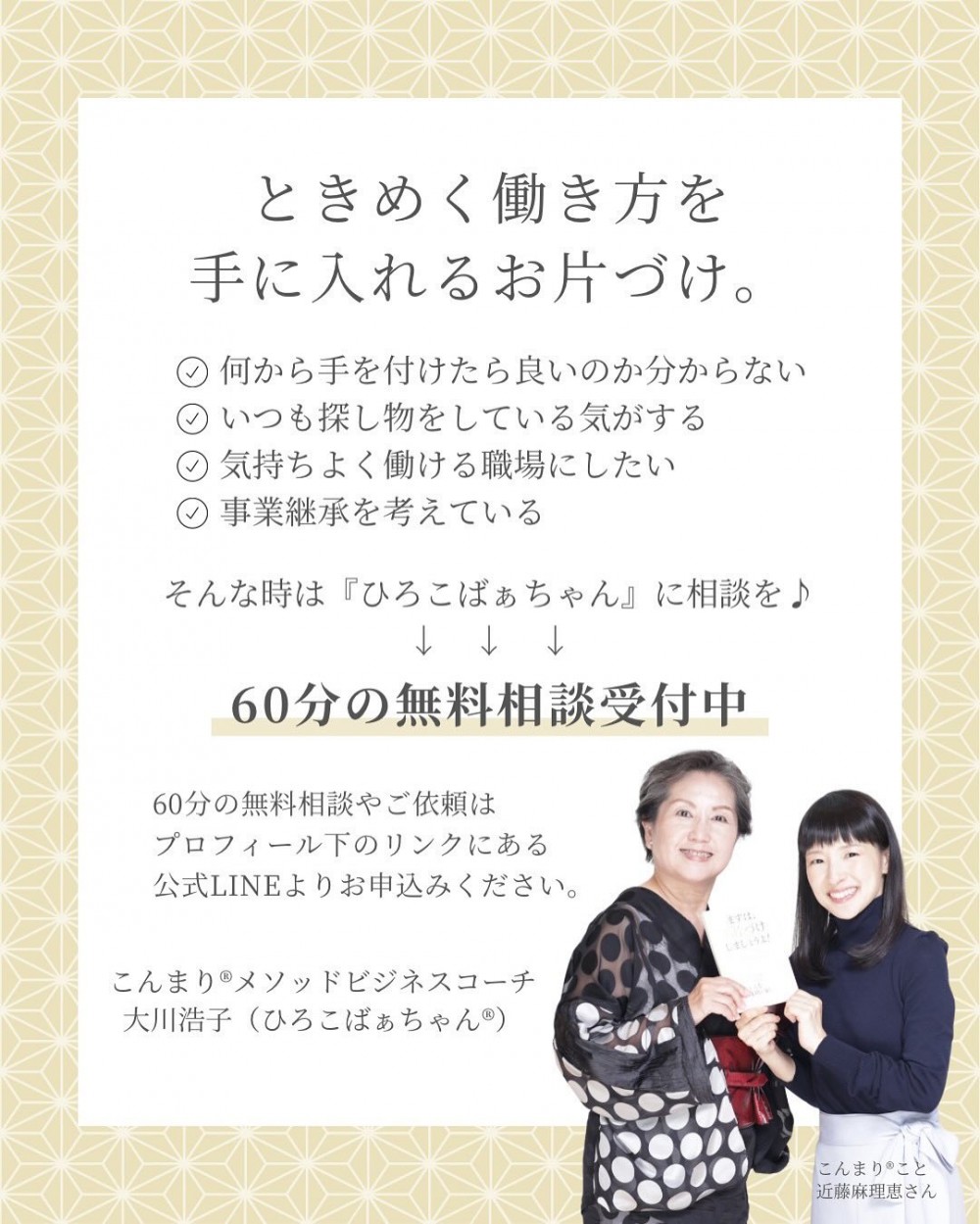 「こんまり®メソッドビジネスコーチ」としての支援:個人の暮らしだけでなく、ビジネスや働き方にも「片づけ」を応用するコーチングを提供。