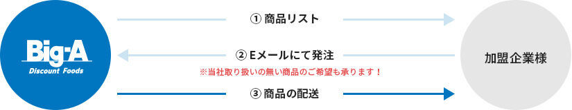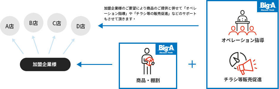 ビッグ・エー企業フランチャイズは、地域流通企業様の「経営の安定」と「地域経済の活性化」のお手伝いをしたいという当社の願いからスタートしました。