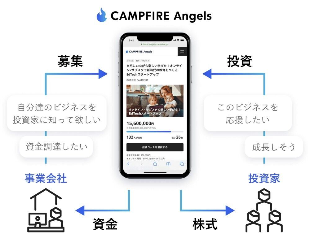 CAMPFIRE Angelsは、資金調達をしたいスタートアップ企業と投資をしたいエンジェル投資家を繋ぐ、 株式投資型クラウドファンディングプラットフォームです。