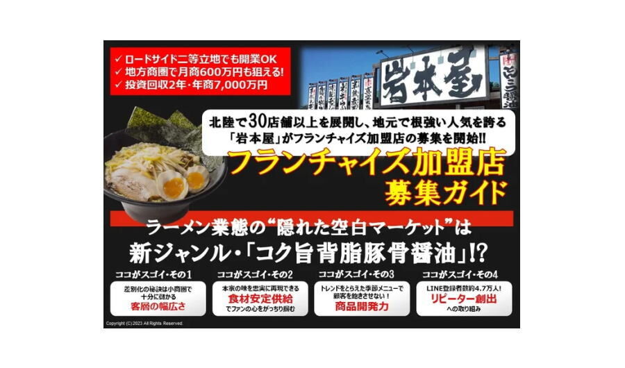 北陸で30店舗以上を展開し、地元で根強い人気を誇る「らーめん岩本屋」がフランチャイズ化。2024年1月より加盟店募集を開始。