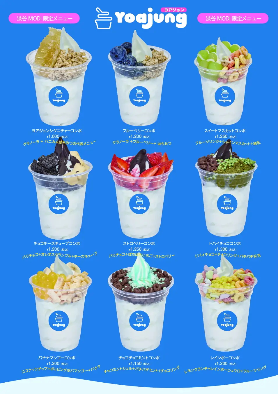 ヨアジョン(YOAJUNG/요아정)は、2021年に韓国で誕生したフローズンヨーグルト専門ブランドです。 店名には「ヨーグルトアイスクリームの定石」という意味が込められており、ヨーグルトソフトにコムハニー(蜂の巣)、フルーツ、シリアル、チョコレートなど、豊富なトッピングを自由に組み合わせてお楽しみいただけます。 ブランドコンセプトは「いつでも、どこでも、自分らしく楽しむ」。ヨアジョンは、プレミアムデザートブランドとして新しいスイーツ体験をお届けします。