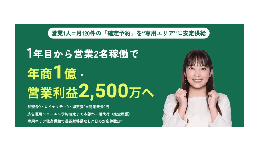 営業1名につき月120件の「確定案件」を本部が供給。全国限定30社・加盟金0円キャンペーンを実施中
