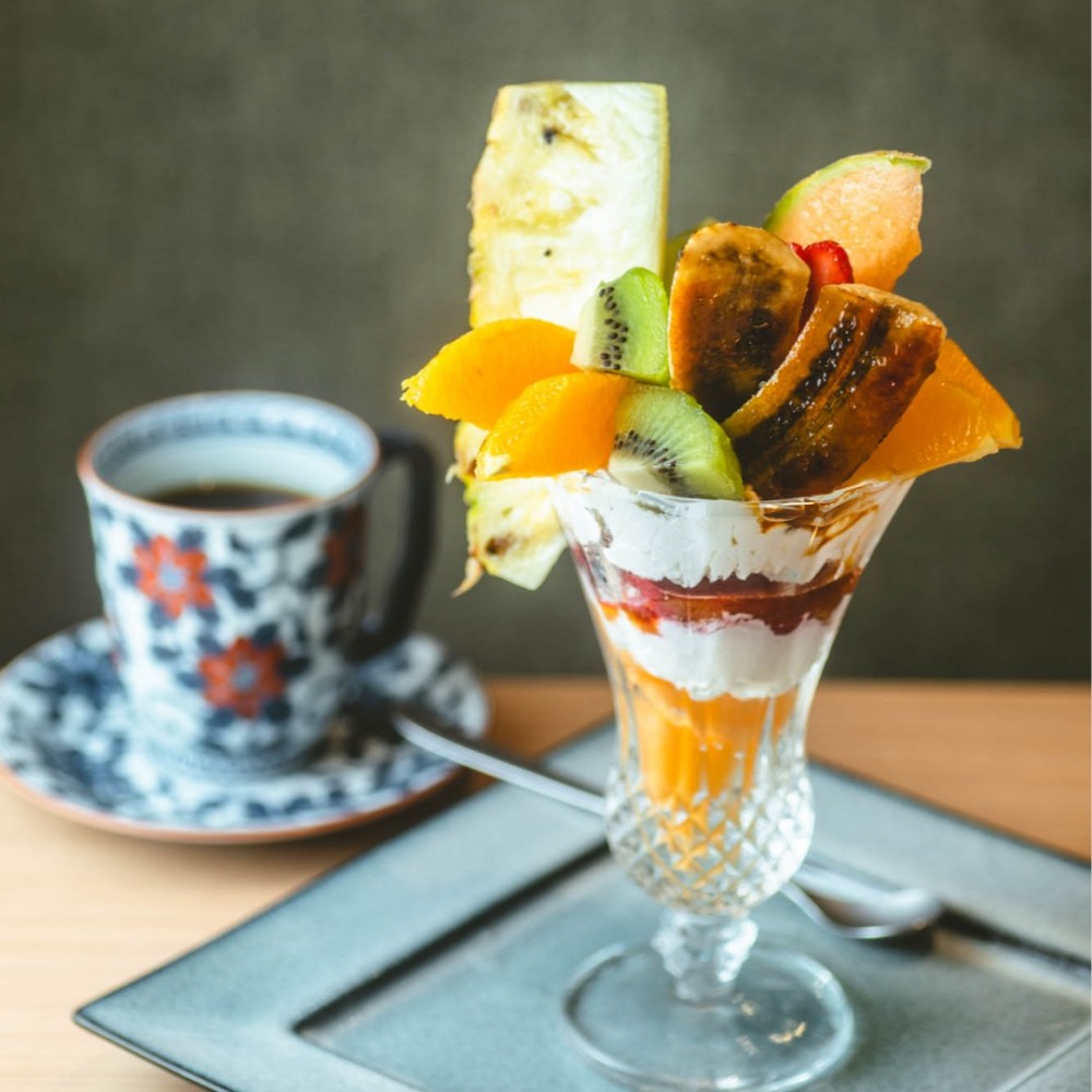 厳選した四季折々のフルーツをふんだんに使ったサンドイッチやデザートが自慢の郊外喫茶店です。珈琲鑑定士がお食事とのマリアージュをイメージした「果実屋ブレンドコーヒー」は、4種類のアラビカ種の豆をそれぞれ焙煎した後に、アフターブレンドで合わせた、フルーツのデザートを引き立てる香りと味わいです。