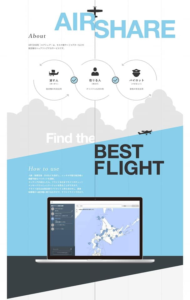 空を自由に移動したい旅行者と、航空機を所有するオーナーと、プロのパイロットをオンラインでマッチングすることで、今まで活用されてこなかった地方空港や小規模な滑走路を含む全国140以上の空港間の気軽な移動を可能とします。