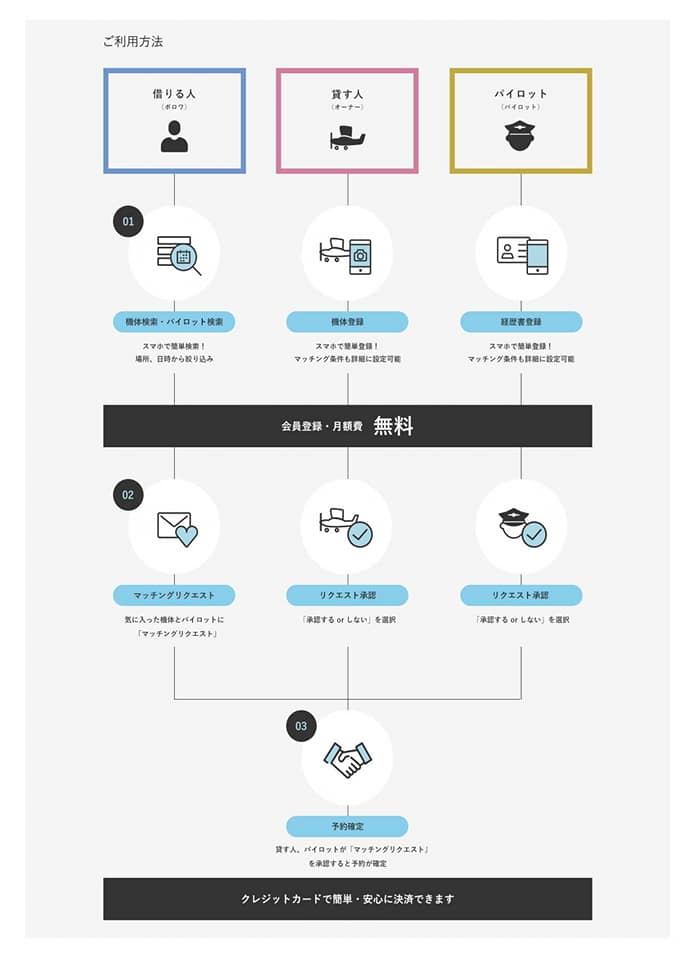 利用者、航空機オーナー、パイロットの3者をマッチングさせ、より自由な空の移動をすることができます。