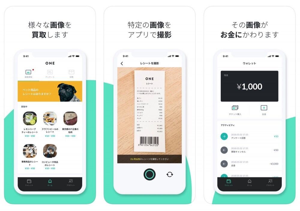 ONE(ワン)は撮影した画像がお金にかわるレシートや画像の買取サービスです。Twitterのトレンド1位を獲得し、数々のメディアに紹介されました。インストールから1分以内にレシートや画像がお金にかわる体験ができます。