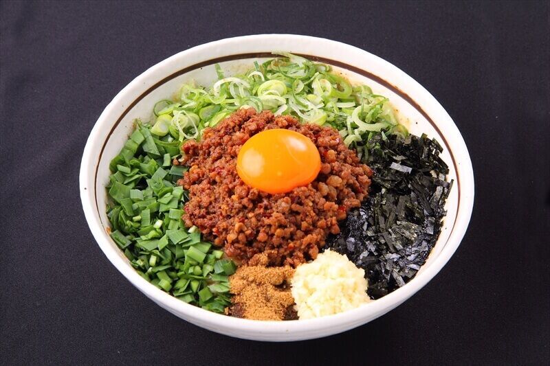 台湾ミンチ(唐辛子とニンニクを効かせた醤油味のピリ辛ミンチ)を極太麺に乗せた、汁無し麺の一種です。