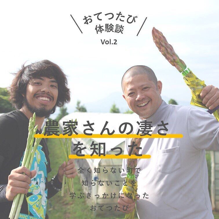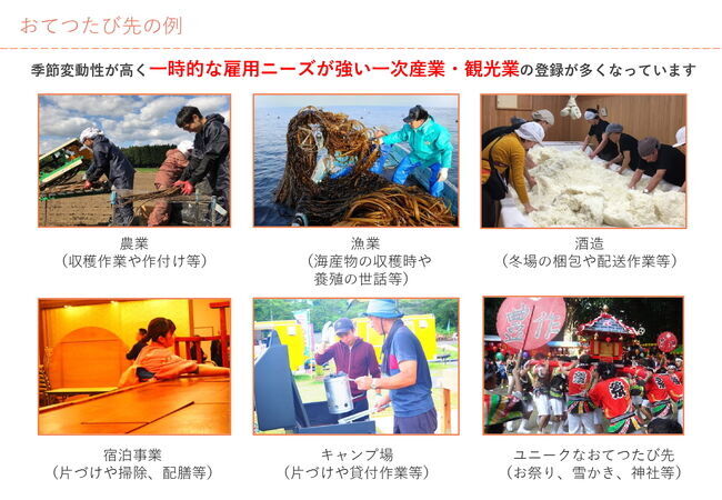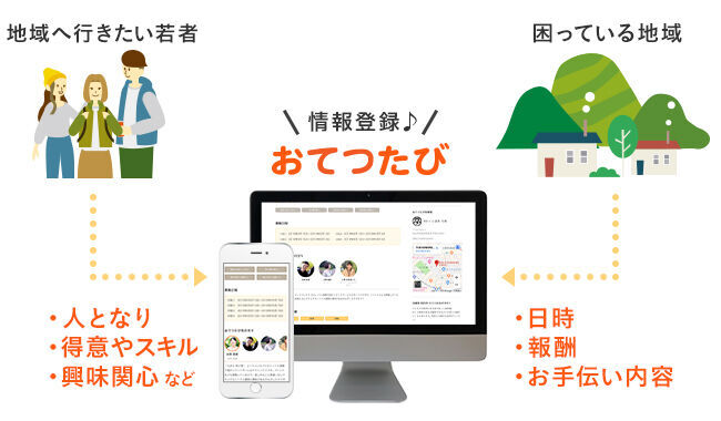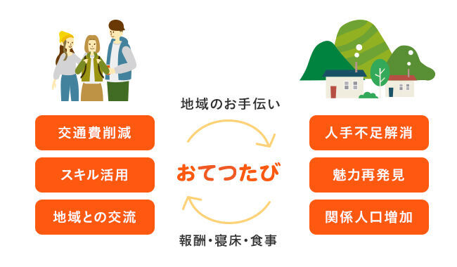 『おてつたび』は、お手伝い(仕事)と旅を掛け合わせた造語で、地域の短期的・季節的な人手不足で困っている農家や旅館などの事業者と、「知らない地域へ行きたい!」「仕事をしながら暮らすように旅したい」と、地域に興味がある若者をマッチングするwebプラットフォームです。『おてつたび』参加者は、お手伝いをすることで事業者より報酬を得ることができるため、旅費自体の削減が可能です。