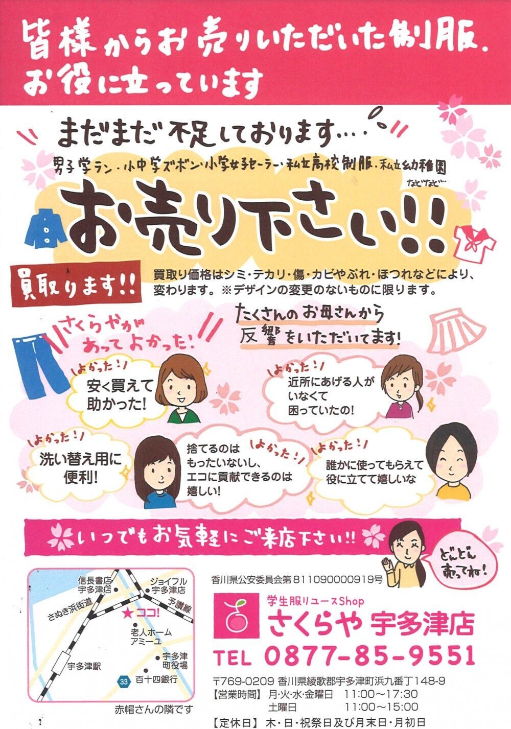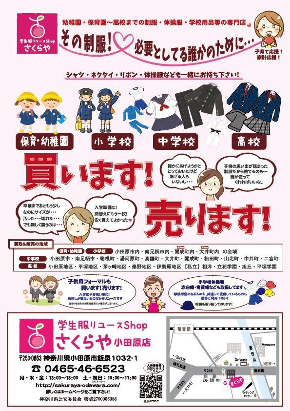 2010年、全国初!どこにもなかったお店 「お母さんの家計応援!!学生服リュースshopさくらや」を創業しました。 さくらやの学生服類は、その学校・幼稚園に通う予定の人と既に通っている人が 着るために販売しております。それ以外の目的のための販売は行っておりません。 さくらやは、全てのお母さんに、学生服類を安心して売っていただき、 安心して買っていただくことを徹底しています。 この信用実績と全国の皆様からの応援がさくらやの励みとなっています。 これからも学生服を通じて社会、地域におけるさまざまな活動に貢献して参ります。