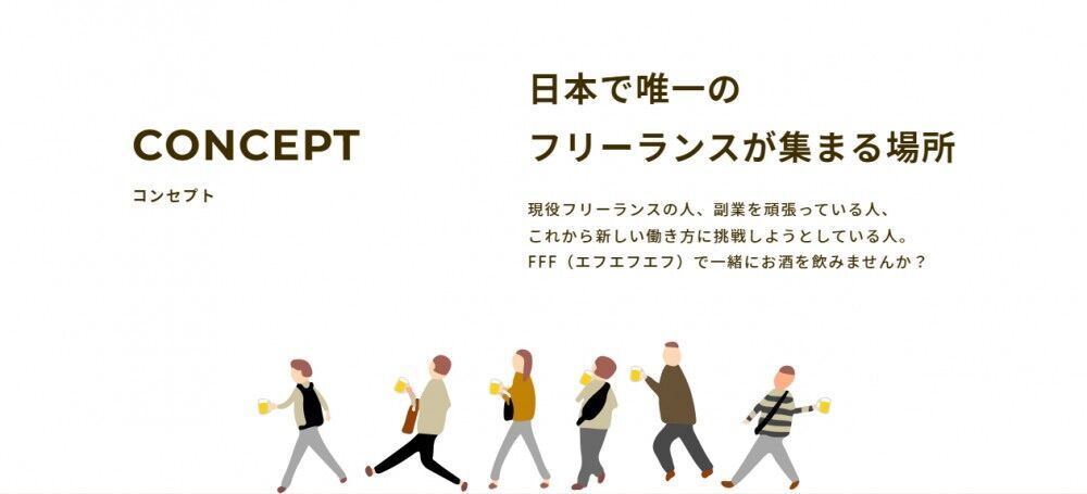 FFFとは「The first bar for freelancers」の略で、フリーランスが集まる唯一のバーであることを意味します。現役フリーランスの人、副業を頑張っている人、経営者、これから新しい働き方に挑戦しようとしている人など多様な働き方の人が集まり、普段は話せない人たちとの交流ができる場を提供します。お酒を飲みながら交流することで、「情報交換」「お仕事の受注」「仕事への刺激」につながれば幸いです。