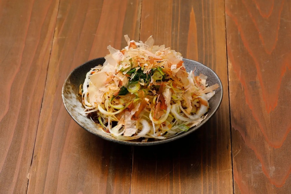 株式会社鳥貴族 会長の青木が考案したメニュー。当時は3種類のネギに、酸味の効いた店仕込みのドレッシングをかけて提供していました。令和版の「ねぎねぎサラダ」は、玉ネギ・白ネギ・青ネギの3種類のネギに、フンドーキンの甘めのごまポン酢が相性抜群のサラダに仕上げました。