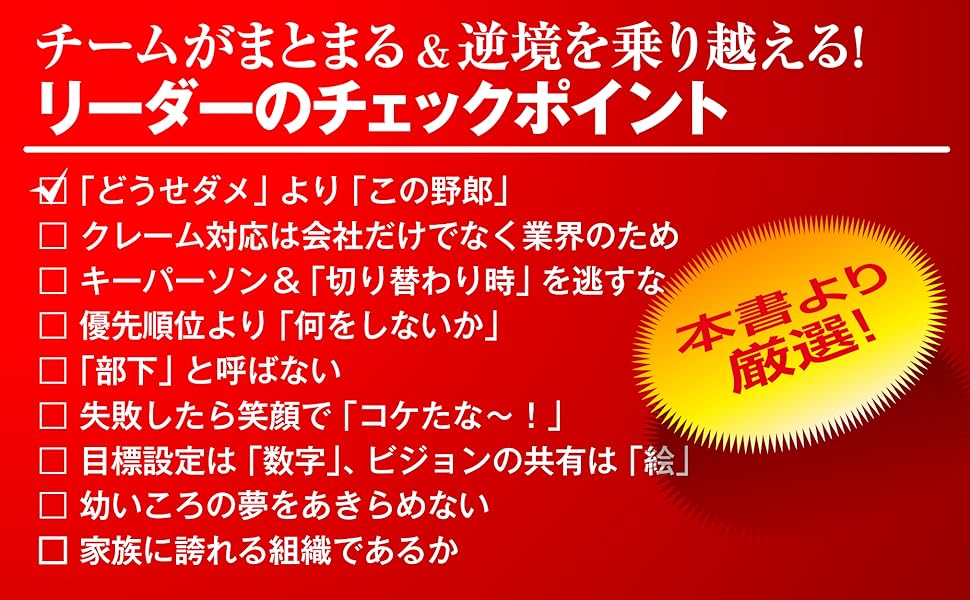本書では、チームや個人の目標を掲げるキャッチフレーズや言葉が数多く登場します。「日本のチョコレートのレベルを引き上げる」「ここをみんなが来たがる部署にしよう!」「孫に語れるような事業にしよう」「行くぞ、売上40億」「自分株式会社」など、著者は売上70億達成の原動力は、目標であり、ビジョンだと強調。それをイメージさせる言葉をチームのメンバーと共有してきたのです。その上で、リーダーの役割は、「まず、リーダー自身が『やれる』と信じること。そしてビジョンは一度や二度ではなく、何度も、折に触れて言うこと。何より、不安なときに山頂の旗を見せることが大事」と語っています。