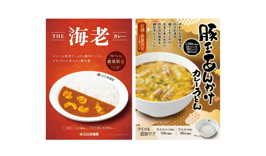 【ココイチ】秋の限定メニュー オマール海老のうまみたっぷりの「THE海老カレー」と店舗限定「豚玉あんかけカレーうどん」を10月1日に販売開始