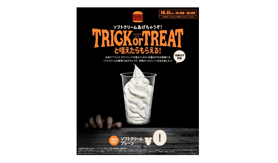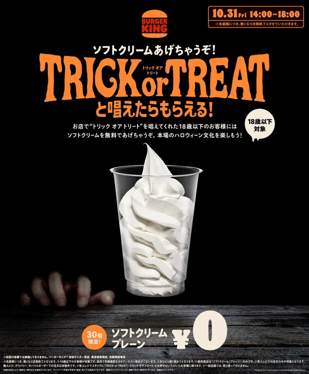バーガーキング® では、全国の皆様に本場のハロウィーン文化を楽しんでいただきたく、2025年10月31日(金)ハロウィーン当日の14:00~18:00の間、全国の店舗でスタッフに「TRICK or TREAT(トリック オア トリート)」と唱えていただいた18歳以下のお客様を対象に、『ソフトクリーム(プレーン)』を無料でプレゼントいたします。