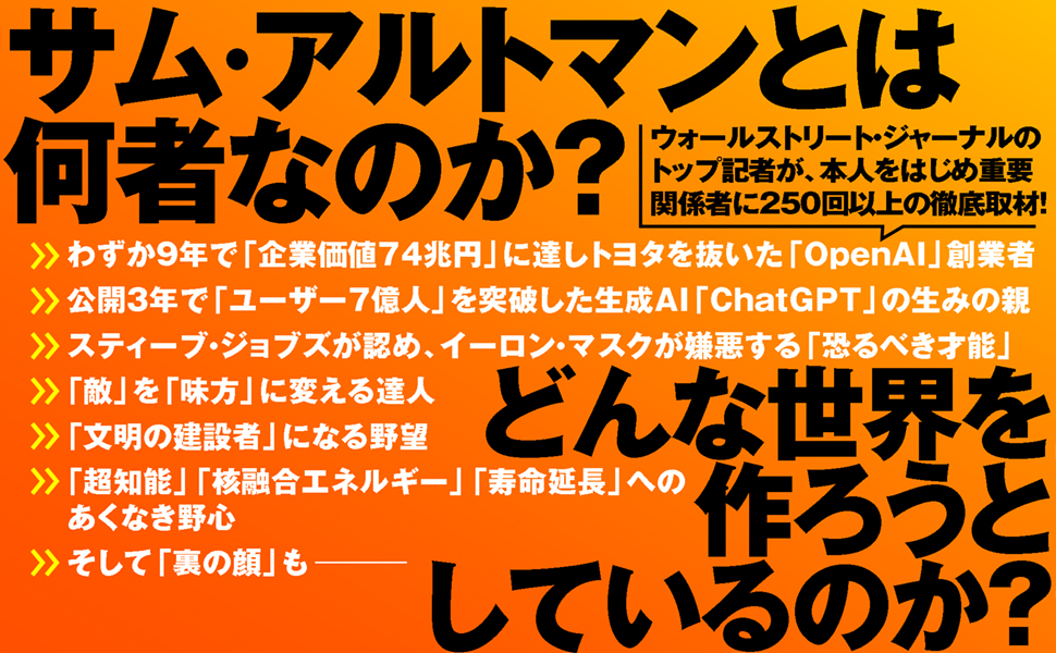 サム・アルトマンとは何者なのか? どんな世界を作ろうとしているのか? アルトマンに密着してきたウォールストリート・ジャーナルのトップ記者が、アルトマン本人、家族、友人、メンター、共同創業者、投資家、第一線のAI研究者、クーデター当事者ら重要関係者に250件を超す大規模取材を敢行。その歩み、スティーブ・ジョブズが認めた才能、常識はずれの思考とビジョン、敵を味方に変える「人たらし」術、共同創業者イーロン・マスクとの泥沼抗争、2023年11月のOpenAI代表「解任」クーデターの真相(本書で初めて明らかになる原因・背景多数)、核融合エネルギーや寿命延長など次世代技術への取り組み、AI未来構想、そして「裏」の顔も――。いま世界が最も注目する天才起業家のすべてに迫る決定版ノンフィクション!