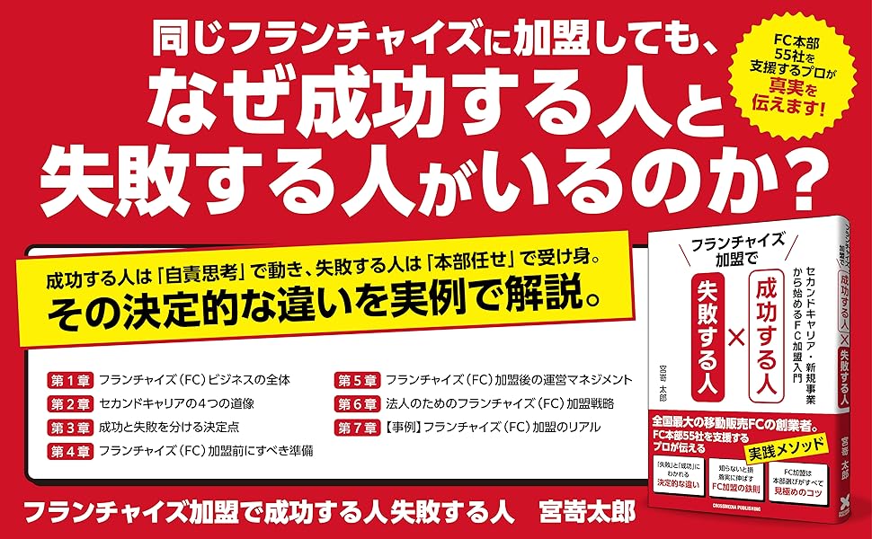 本書では、著者が長年のFC業界経験から導き出した「成功する人」と「失敗する人」の明確な特徴を詳しく解説。失敗する人は「FC本部が何とかしてくれる」と受け身で開業し、会社員時代の感覚を引きずって迅速な判断ができません。一方、成功する人はFC加盟前に自分に合った本部かを見極め、経営者として自分の判断で動く覚悟を持っています。
