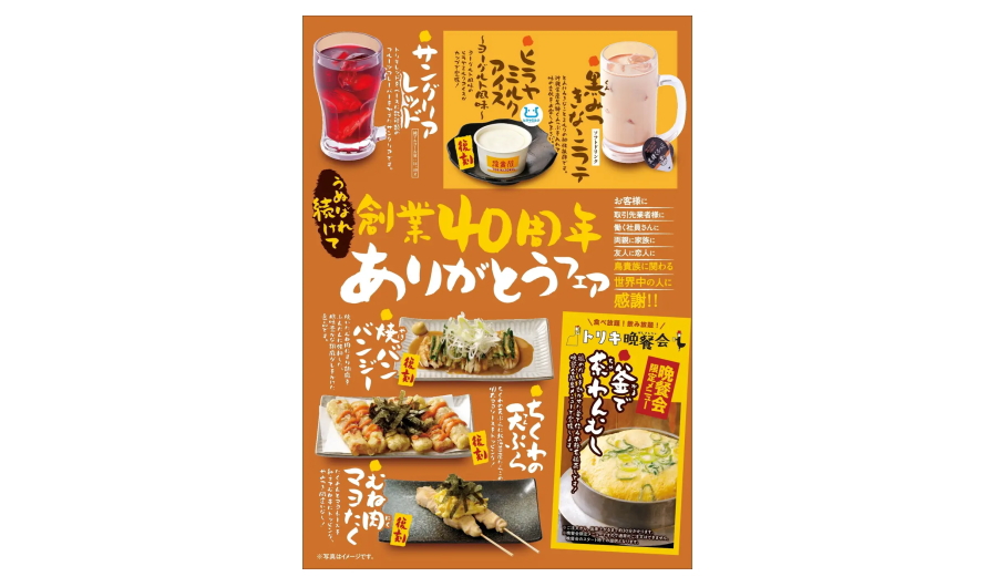 焼鳥屋「鳥貴族」は、2025年5月1日に40周年を迎えることができました。お客様や取引業者様、店舗で働く社員さん、鳥貴族に関わる世界中の人に感謝をお伝えするべく、『うぬぼれ続けて創業40周年 ありがとうフェア』と題し、年間を通じてみなさまに喜んでいただけるような期間限定メニューを展開しています。