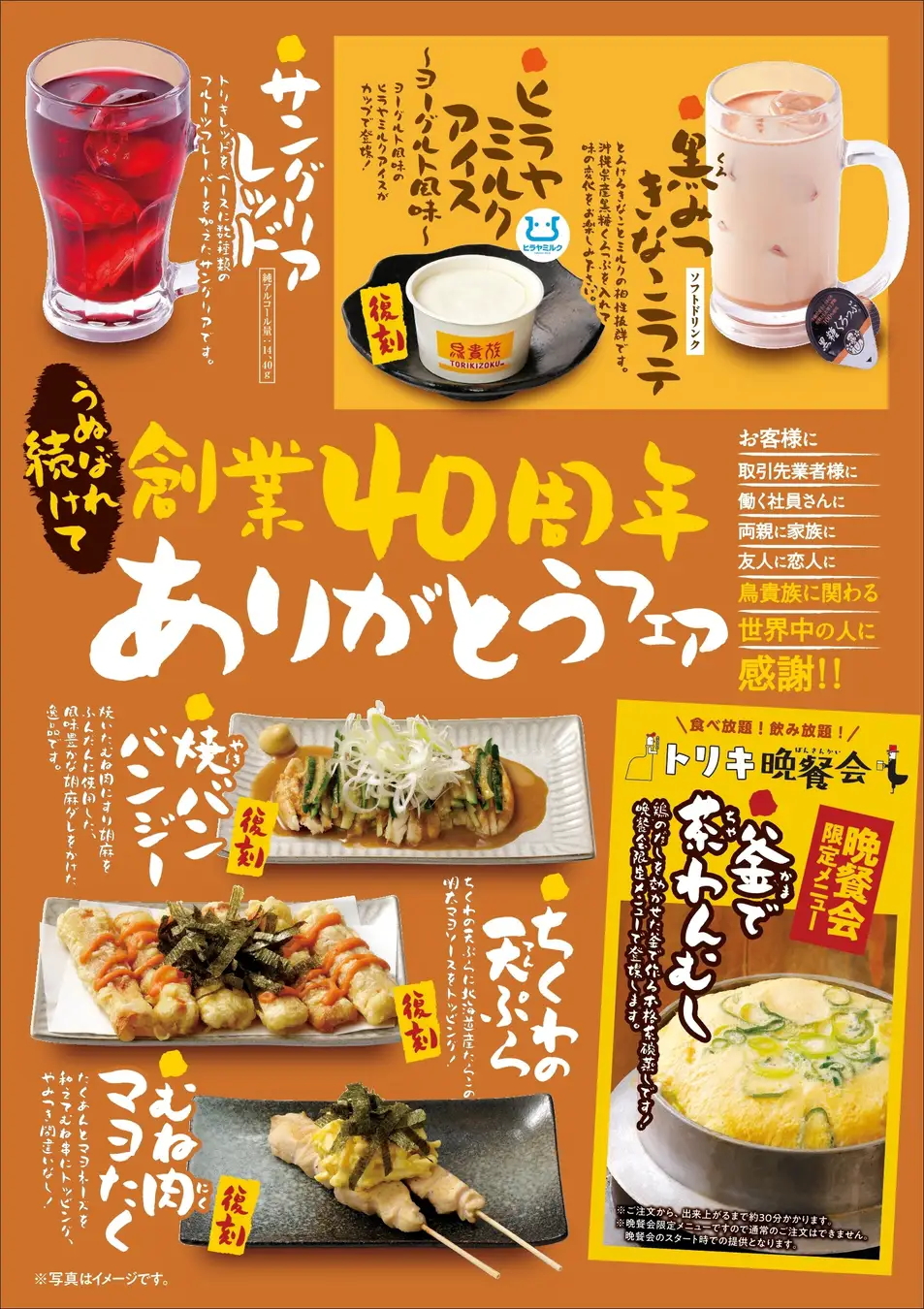 株式会社エターナルホスピタリティグループ(本社:大阪市中央区 代表取締役社長:大倉 忠司)が展開する焼鳥屋「鳥貴族」は、12月1日(月)より、『うぬぼれ続けて創業40周年 ありがとうフェア』第3弾を開始いたします。令和版にバージョンアップして復刻した「焼バンバンジー」や「ちくわの天ぷら」のほか、ジャパン・フード・セレクション(一般社団法人日本フードアナリスト協会の第87回食品・飲料部門 ※2025年5月)でグランプリを受賞したオリジナルワインであるトリキレッドを使った「サングリアレッド」など期間限定メニュー全6品と、食べ飲み放題プランのトリキ晩餐会限定メニュー「釜で茶わんむし」の提供を開始いたします。