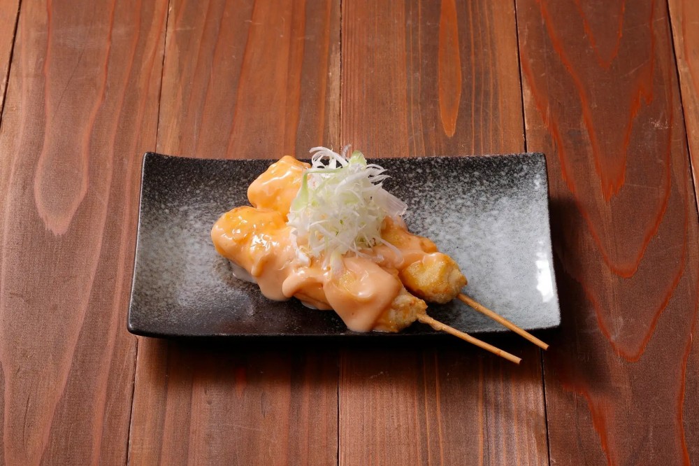 鳥貴族創業初期の商品開発チーム発足時、初めての創作串としてメニュー化された「とり天マヨ串」。某人気番組の鉄人が考案した‟エビマヨ”を、鶏肉で再現。創業当時の味わいを参考に再現した、お店仕込みのマヨソースは、とり天との相性抜群です。