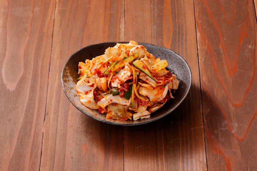 親鳥炙り焼に、キャベツとキューリを合わせ、こだわりのコチョリのタレとごま油で和えました。発酵させずに食べる生キムチは、酸味がなくシャキシャキとした野菜の食感が楽しめます。