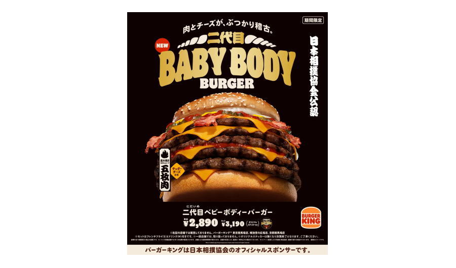 株式会社ビーケージャパンホールディングス(本社:東京都千代田区、代表取締役社長:野村 一裕)は、公益財団法人 日本相撲協会(所在:東京都墨田区、理事長:八角 信芳)とスポンサー契約を締結しており、日本の国技である「大相撲」を応援しています。このたび2026年5月1日(金)より、バーガーキング® 自慢の直火焼きの100%ビーフパティ5枚とチェダーチーズ8枚を使用した、肉とチーズがぶつかり合う“横綱級”の超大型チーズバーガー『二代目BABY BODY BURGER(ベビーボディーバーガー)』(総カロリー1,856kcal*1、総重量661g*2)を期間限定で新発売いたします。