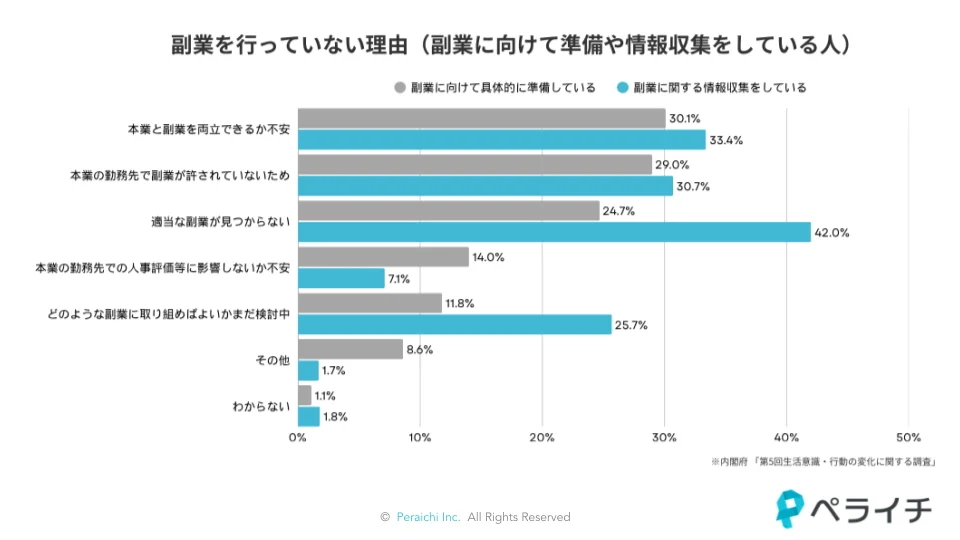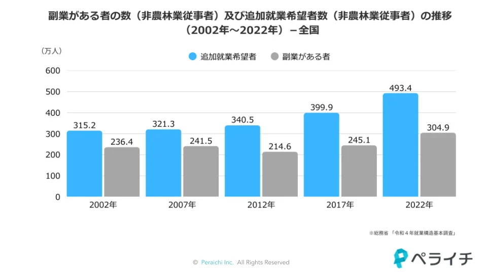株式会社ペライチ(本社:東京都港区 代表取締役CEO:藤本旬)は、総務省「令和4年就業構造基本調査」と内閣府「令和5年度 年次経済財政報告」等の政府統計を横断し再集計したところ、副業をしたい人(副業潜在層)493万人に対して、実際に副業をしている人は305万人にとどまり、依然として大きなギャップが存在することが明らかになりました。副業に踏み出せない最大の理由は「適当な副業が見つからない」(42%)です 。しかしその背景には、企業の制度的な壁だけでなく、「自分に合う仕事がわからない」「できる気がしない」といった個人の自信の欠如、すなわち「心理的な壁」が大きく影響していることが判明しました 。ペライチは、この課題解決のキーワードが、個人の強み発見から実践までをサポートする「伴走」にあると分析します 。