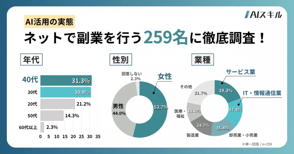 3万人以上が受講した「最新AI活用セミナー」を提供するAIスキルアカデミーでは、インターネットで副業を行う男女259名を対象に、「副業とAI活用に関する実態調査」を実施しました。