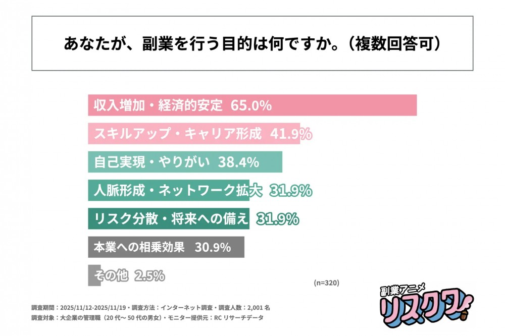 現在副業をしている大企業の管理職の65%が、「収入増加・経済的安定」を目的に副業を行っている