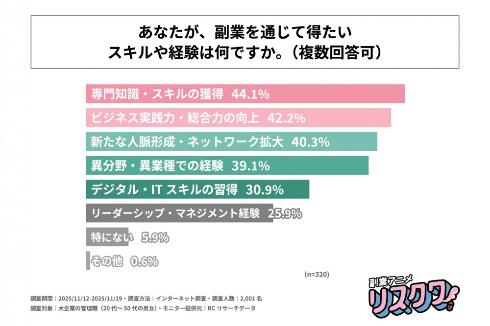 続いて、現在副業を行っていると回答した人を対象に「副業を通じて得たいスキルや経験」を尋ねる設問への回答では、1位が「専門知識・スキルの獲得」で44.1%、2位が「ビジネス実践力・総合力の向上」で42.2%、3位が「新たな人脈形成・ネットワーク拡大」で40.3%という結果になりました。この結果から、現在副業をしている大企業の管理職が副業を通じて得たいスキルや経験は「専門知識・スキルの獲得」が最も多く、次いで「ビジネス実践力・総合力の向上」と「新たな人脈形成・ネットワーク拡大」が僅差で続くことが明らかになりました。