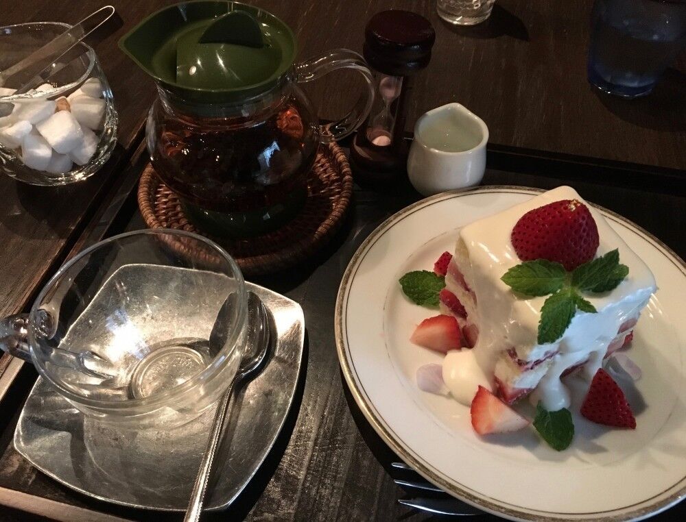 - 四角いいちごのショートケーキの上にクリームがとろりとたっぷり。ケーキの周りにはいちごはお花などが並べられており、彩りも素敵です。上のクリームには練乳が入っていて、濃厚な甘さを感じました。ミルクティーとの相性は抜群。素敵な空間で美味しいスイーツとカフェを頂け、大満足。